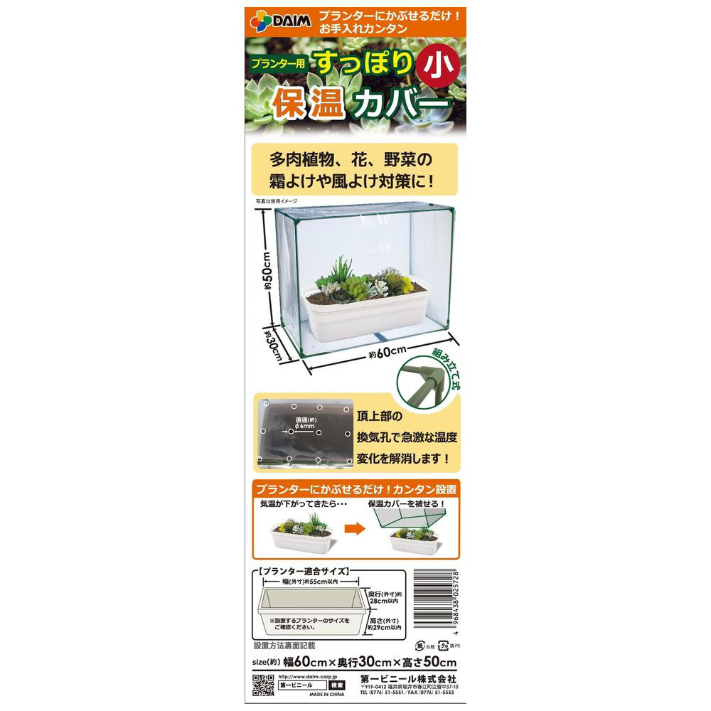 手軽に使える保温カバーで、多肉植物や野菜苗を保温・霜よけ・風よけします。換気孔付きで温度変化から守り、固定バンドで安心です。