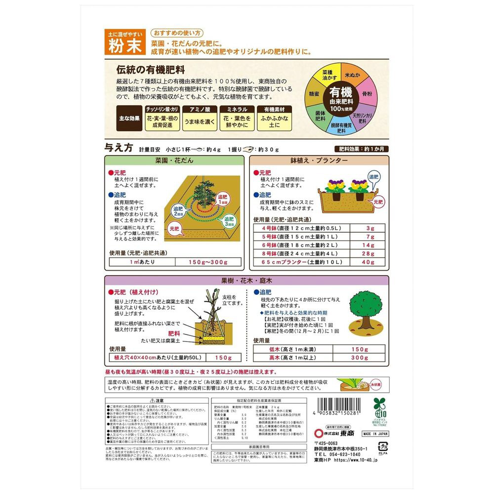 【特徴】・厳選した7種類以上の有機由来肥料を100%使用し、東商独自の発酵製法で作った伝統の有機肥料です。・特別な発酵菌で発酵しているので、植物の栄養吸収がとてもよく、元気な植物を育てます。・土に混ぜやすい粉末タイプです。・菜園・花だんの元肥に。成育が早い植物への追肥やオリジナルの肥料作りにもおすすめです。・肥料効果は約1ヶ月持続します。