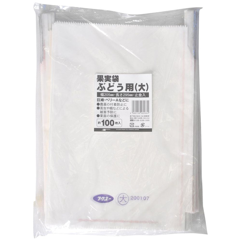 果実袋・ぶどう用・100枚入です。【用途】果面の保護、防虫・防鳥、農薬の付着防止用。【機能・特徴】果実袋ぶどう用です。止金入りです。大サイズです。