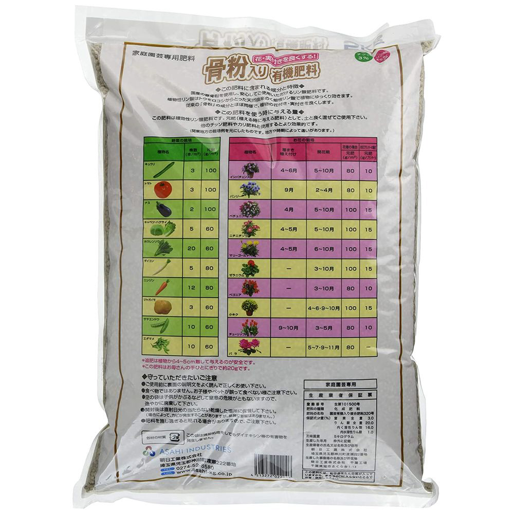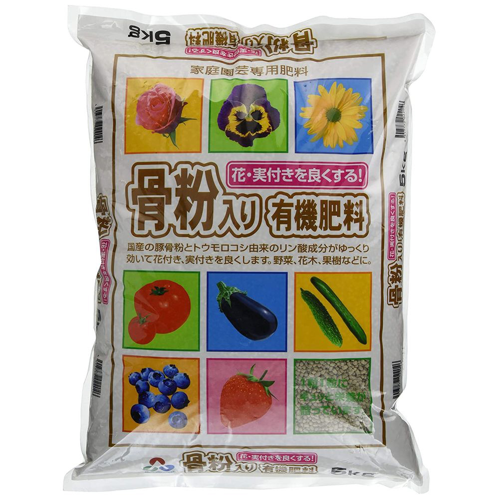 実付き・花付きを促進する有機肥料。豚骨粉とトウモロコシ由来のリン酸成分配合で、ゆっくりと効きめが持続します。