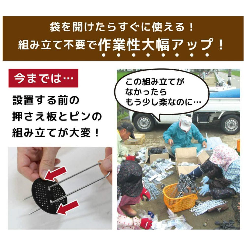 作業効率UP。組み立て不要のシート押さえピン。ピンと押さえ板がセットで、土に差し込みやすく、紛失防止にもなります。