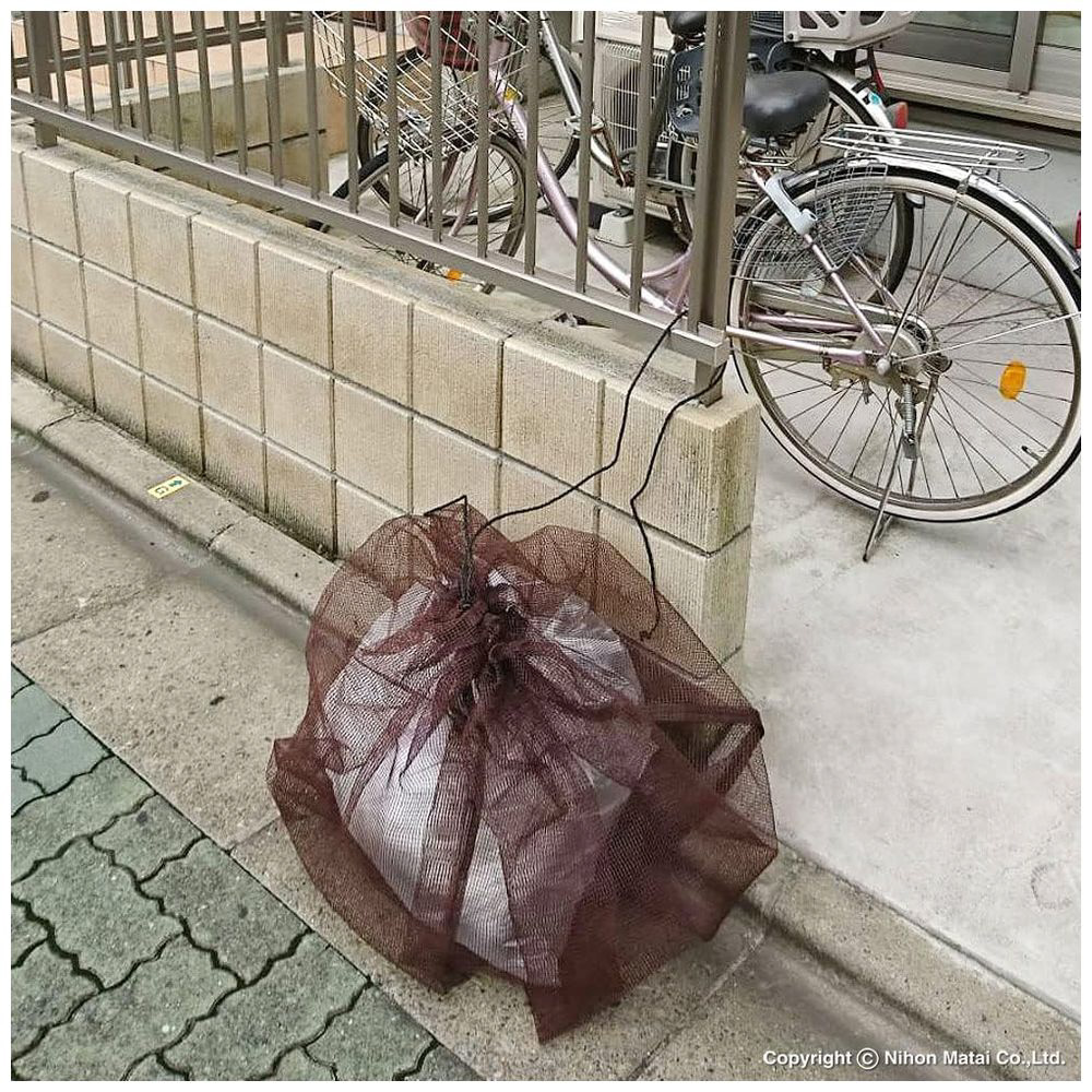 カラスよけに最適なブラウン色の巾着型ネット。4mm目合の網目と重いおもりロープで、ゴミの飛散を防ぎます。