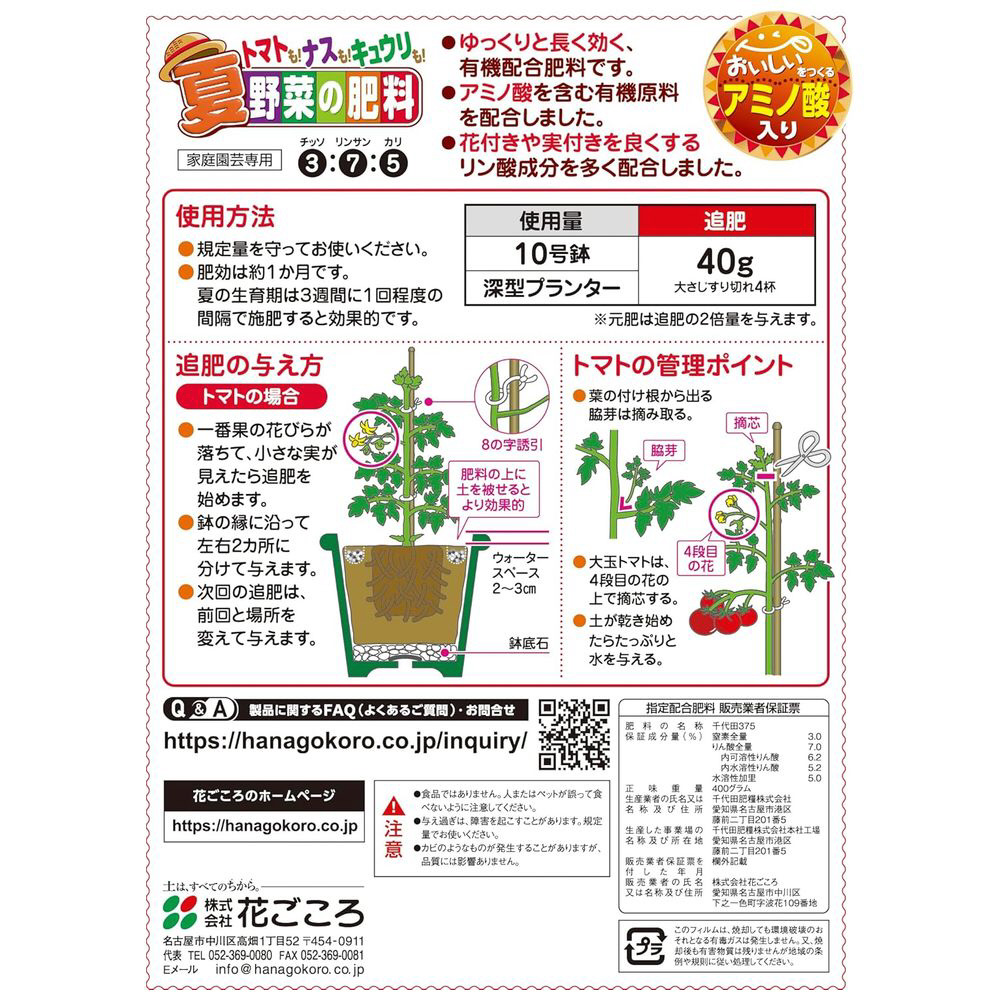 ゆっくりと長く効き、アミノ酸を含む有機原料とリン酸成分を多く配合することで、花付きや実付きをよくします。