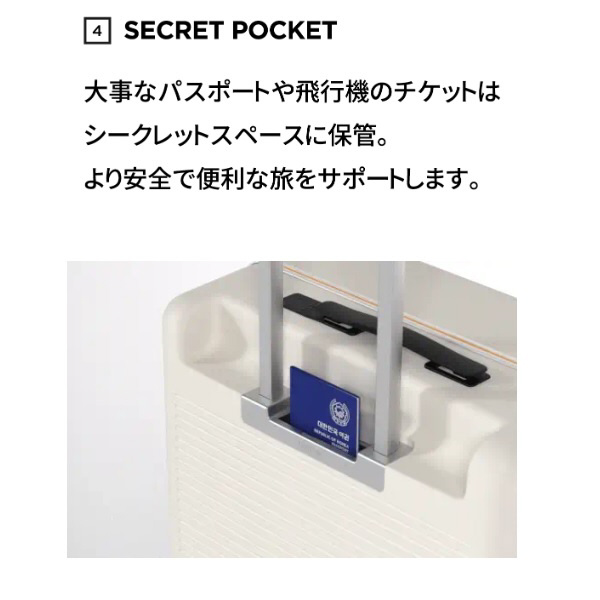 パスポートや財布など、すぐに取り出したいアイテムを収納するためのポケットをTTハンドルの下に搭載。