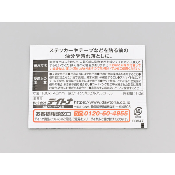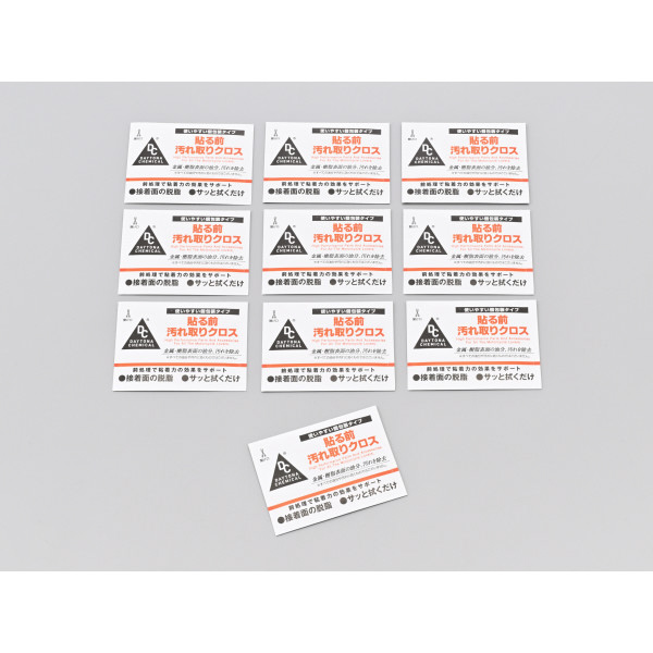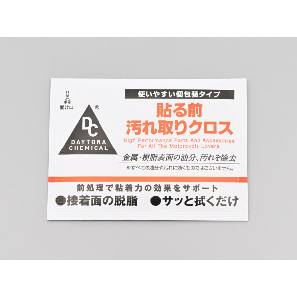 ステッカーやテープなどを貼る前の油分や汚れ落とし用のシート。作業前に使用する事によって、ステッカーなどの定着を安定させます。使いやすい個包装タイプ。