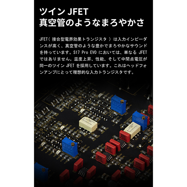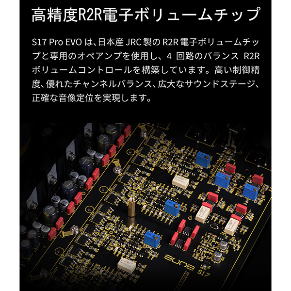 JRCのR2Rボリュームとフルディスクリート回路を組み合わせたS17 ProEVOは、高い制御精度とバランスの取れた音質再生を実現します