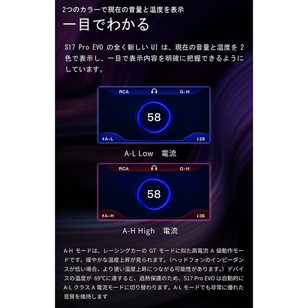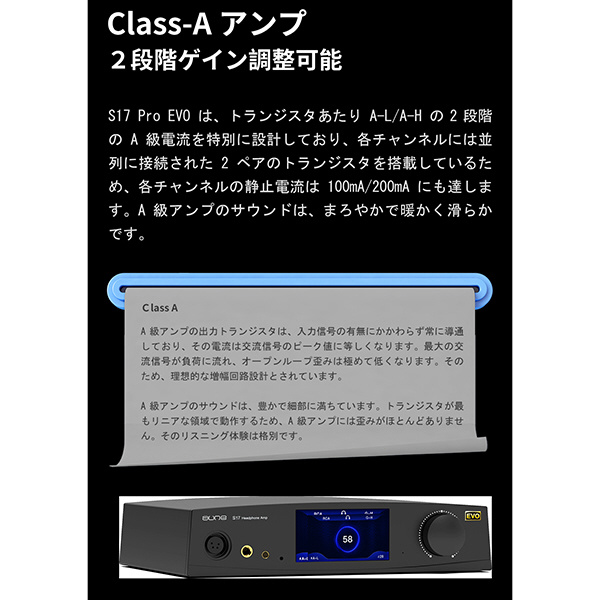 クーラー構造を備えたS17 ProEVOは、熱を効果的に排出し、安定したクラスAアンプの動作を保証します。これにより、高品質の音楽再生が可能となります。
