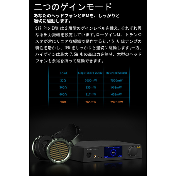 チャンネルごとに2つのトランジスタを使用し、16個の並列接続された出力トランジスタを備えたS17 ProEVOは、最大7.5Wの出力を実現し、あらゆる種類のヘッドフォンやIEMを効果的に駆動します。