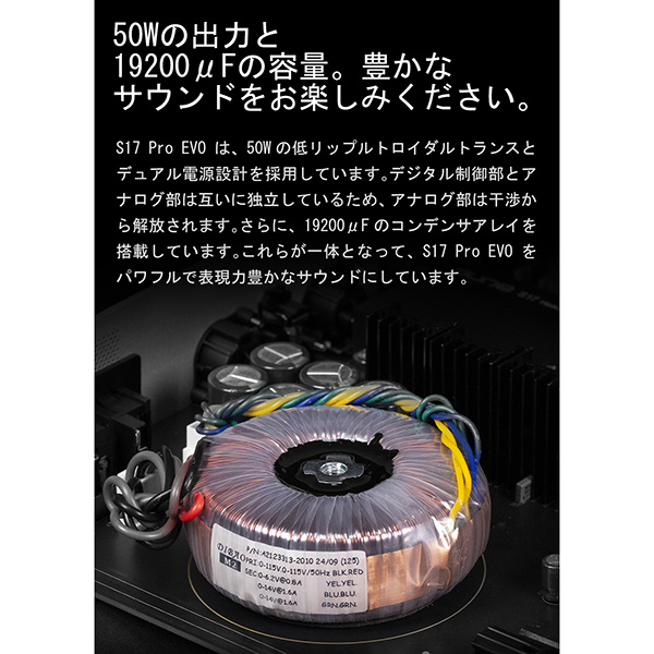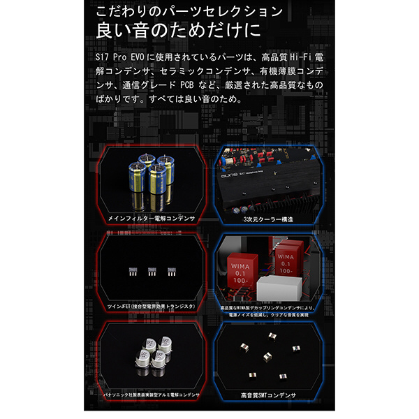 S17 ProEVOには、高品質な電解コンデンサ、セラミックコンデンサ、有機薄膜コンデンサなど、音質向上に貢献する厳選された部品が使用されています。S17Proからさらに使われているパーツにこだわり、総部品数は20個以上増えました。また、出力部ごとのヴォリュームのメモリ機能やディスプレイ表示機能も強化されました。