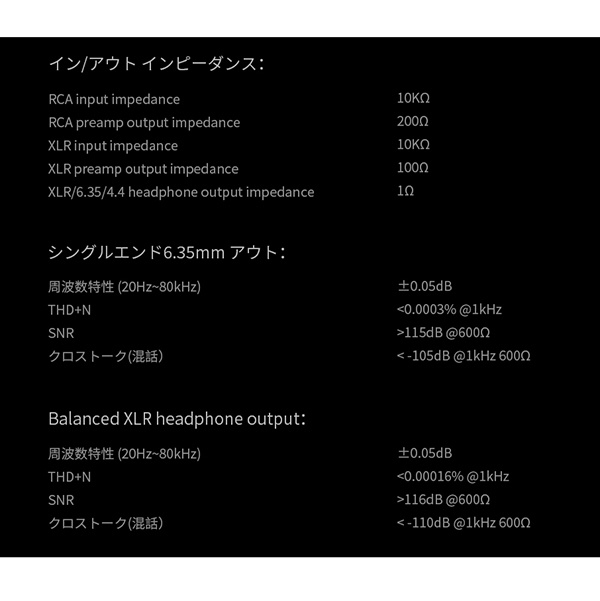 XLR/6.35/4.4ヘッドフォン出力インピーダンス:1Ω