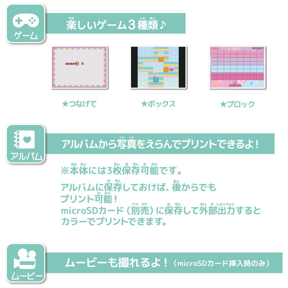 ・アルバムに保存できるので、後から何枚でも印刷ができます。(※microSD未装着の場合、本体保存可能枚数は3枚)