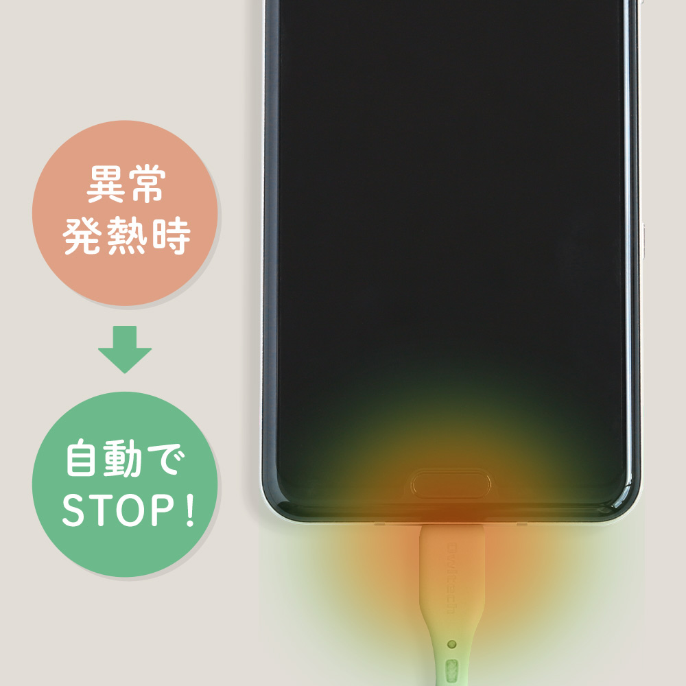 コネクター部分に温度センサー(PTC)を搭載しているので、万が一異常な発熱が生じた場合も接続機器への電流をストップして過熱を防止します。
