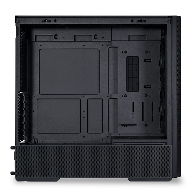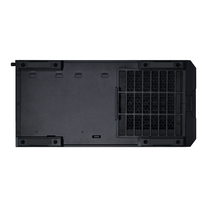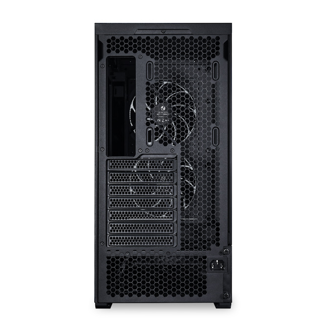 PSUのフロント配置やオフセットされたマザーボードトレイにより、小型ながら360mmラジエーター、ATX電源、最大375mmまでのGPUをサポート。冷却においては、フロントに30mm厚の140mm PWMファン2基、PSUシュラウド上に25mm厚の120mm PWMファン2基を標準搭載しており、全面および下面から導入した外気を効率よく上面メッシュパネルから排出することで、卓越した冷却性能を実現しました。