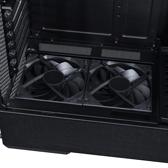 ■フロントに30mm厚の140mm PWMファン2基、PSUシュラウド上に120mm PWMファン2基を標準搭載