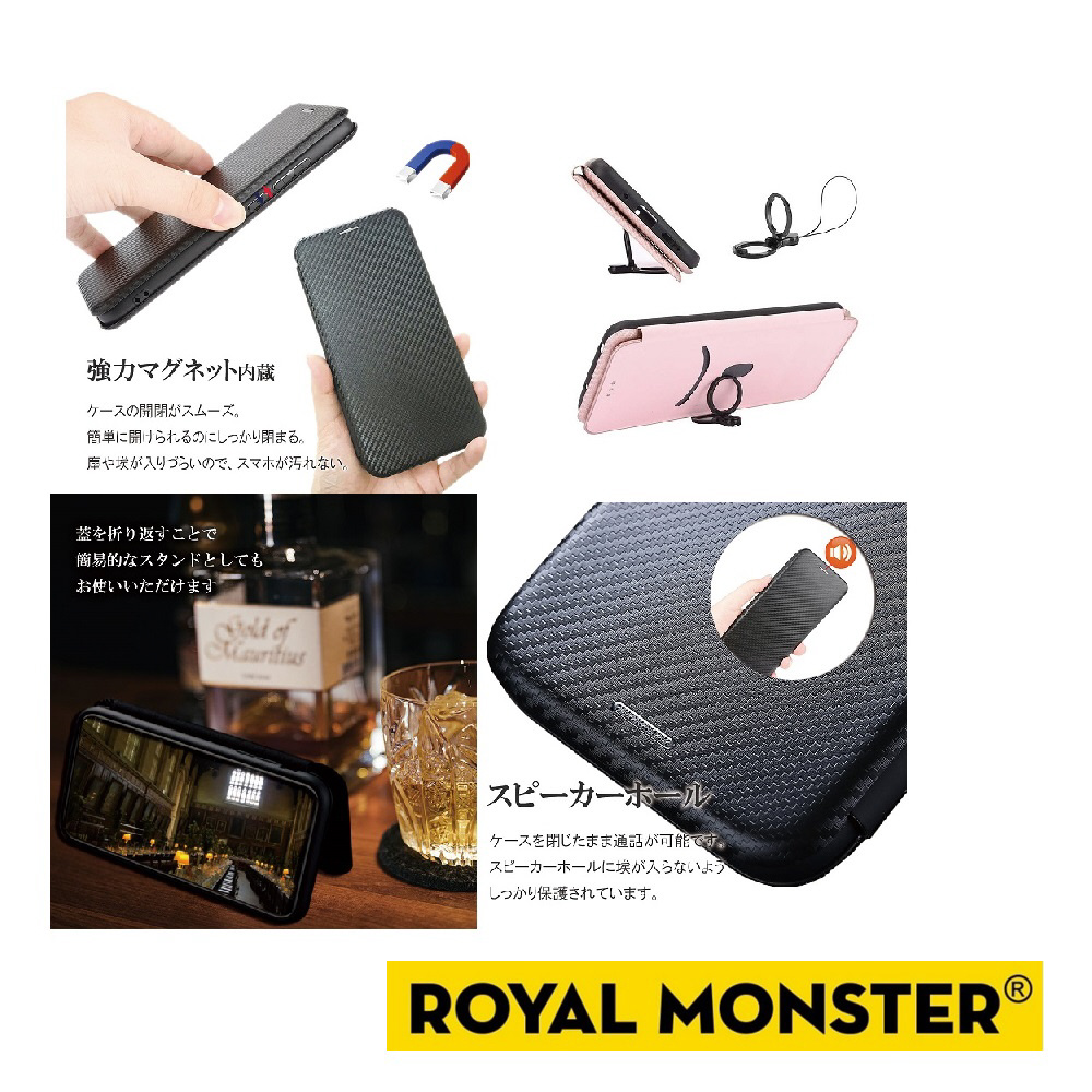 ●カーボンファイバーの素材を活かしたデザイン。手帳型ケースの開閉部にはマグネットを採用。