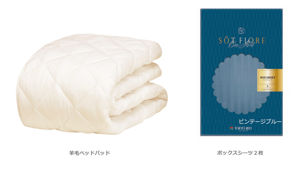 羊毛ベッドパッドとソートフィオレボックスシーツ2枚がセットになったお得なセットです。