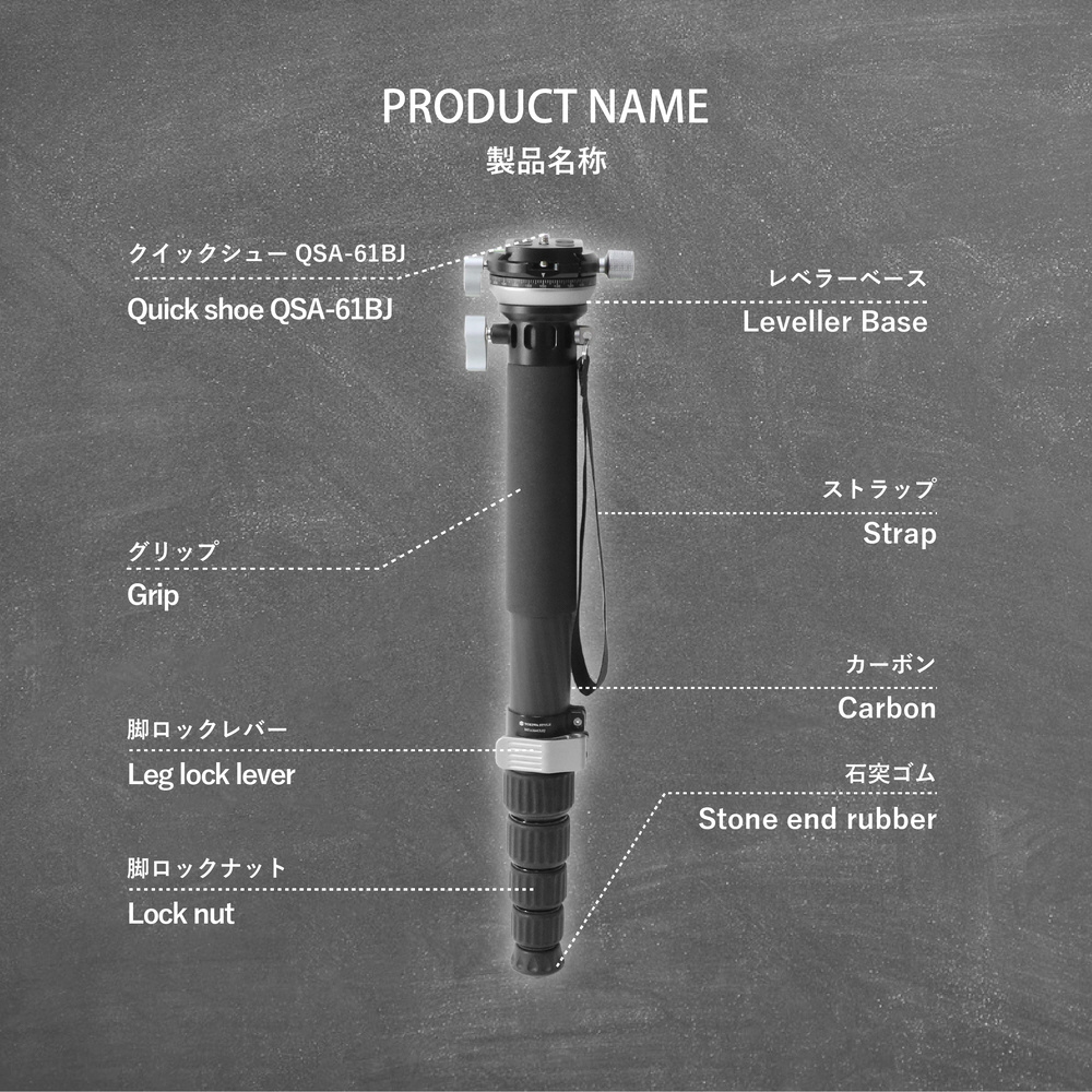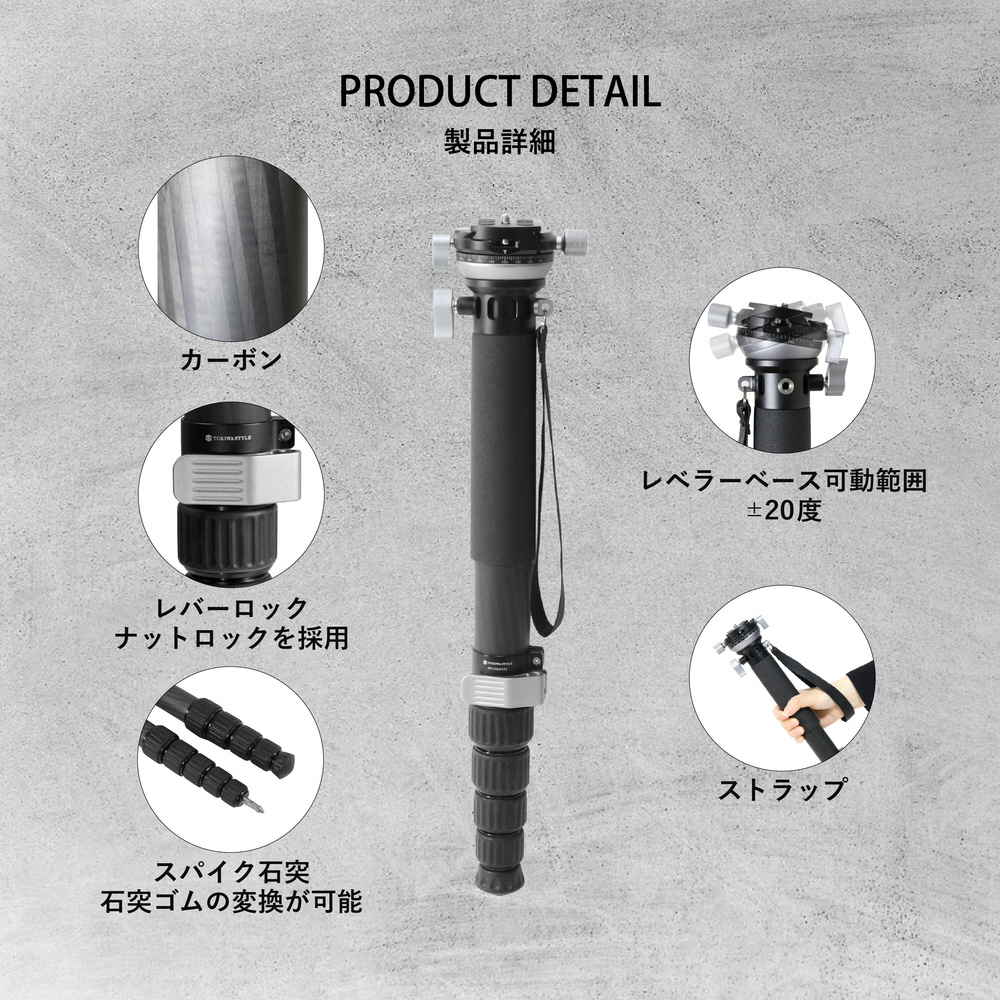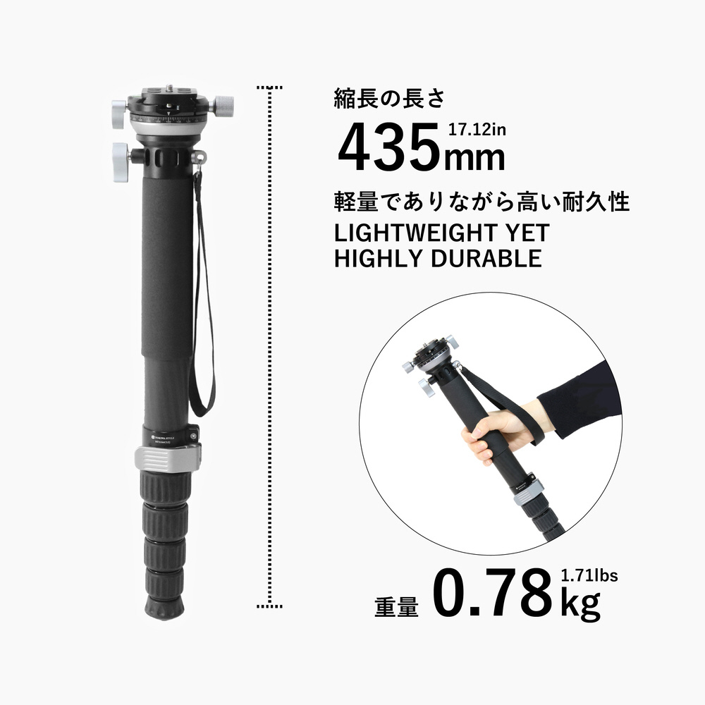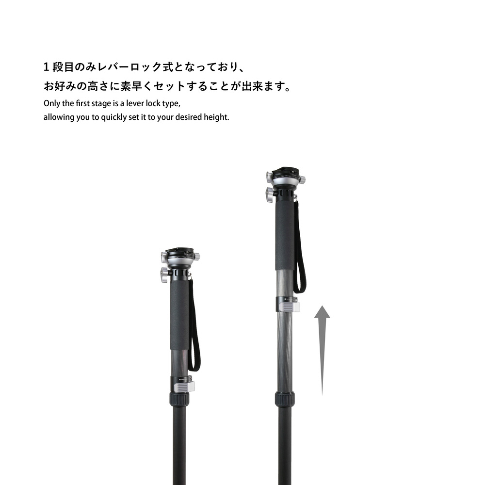 36mmのパイプ径による堅牢さを持ちつつ、カーボン素材を使用する事により軽量化も実現。多機能な6段階調整機能により、お好みの高さに素早く微調整できるため、様々なシーンで活躍します。レベラーベースが付いているため、地面が不安定な撮影場所でも簡単に水平を保つことができます。これにより、イメージした構図を実現し安心して撮影が出来ます。