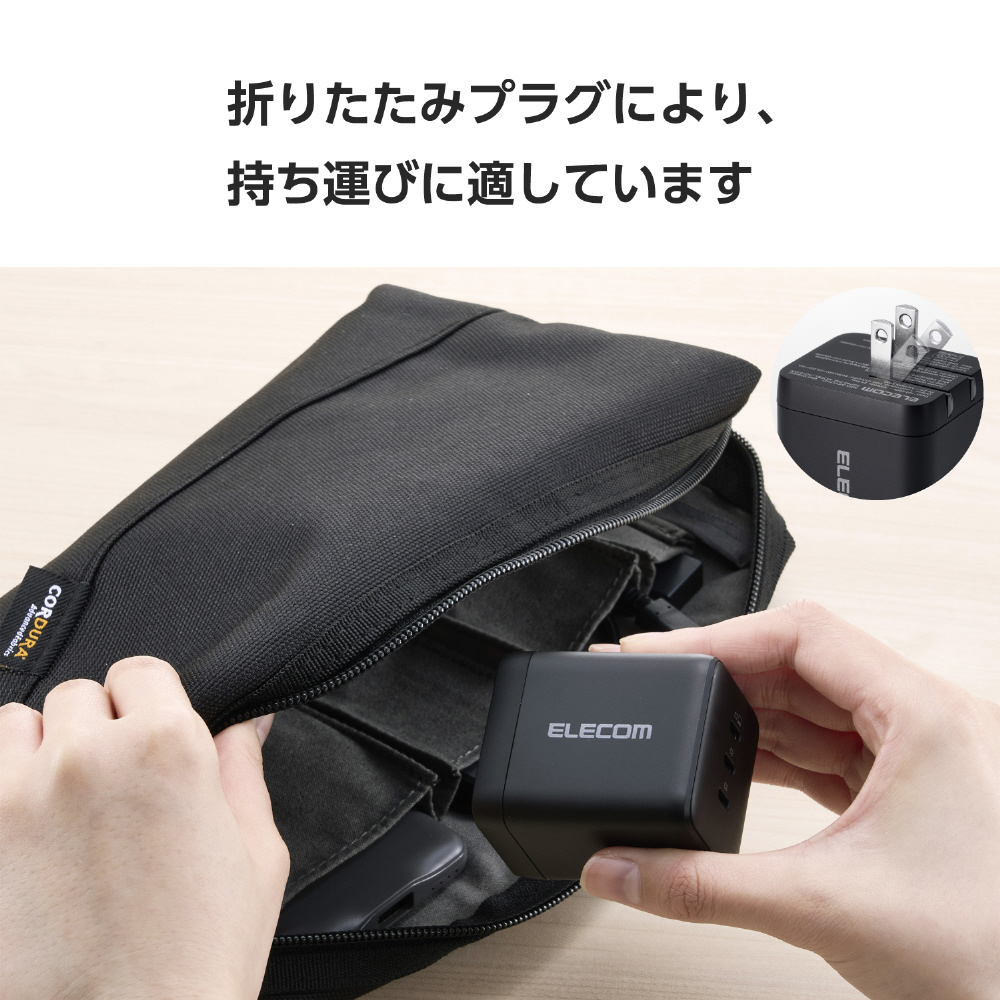 GaN II(窒化ガリウム)を採用し、高出力ながらコンパクトサイズを実現。プラグ部分も折り畳むことができるため、バッグの中でもスペースを取らず、ビジネスでの外出やリモートワーク、出張、旅行など持ち運びにも便利です。