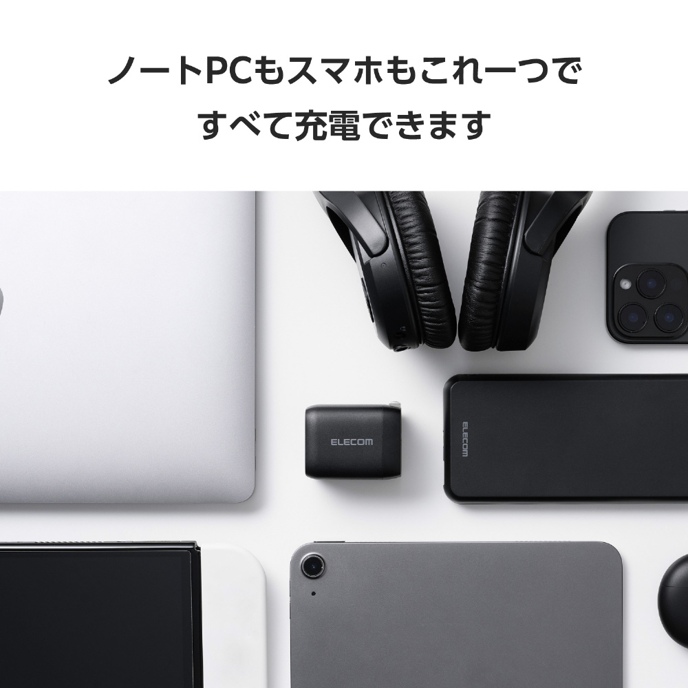 GaN II(窒化ガリウム)を採用し、高出力ながらコンパクトサイズを実現。プラグ部分も折り畳むことができるため、バッグの中でもスペースを取らず、ビジネスでの外出やリモートワーク、出張、旅行など持ち運びにも便利です。