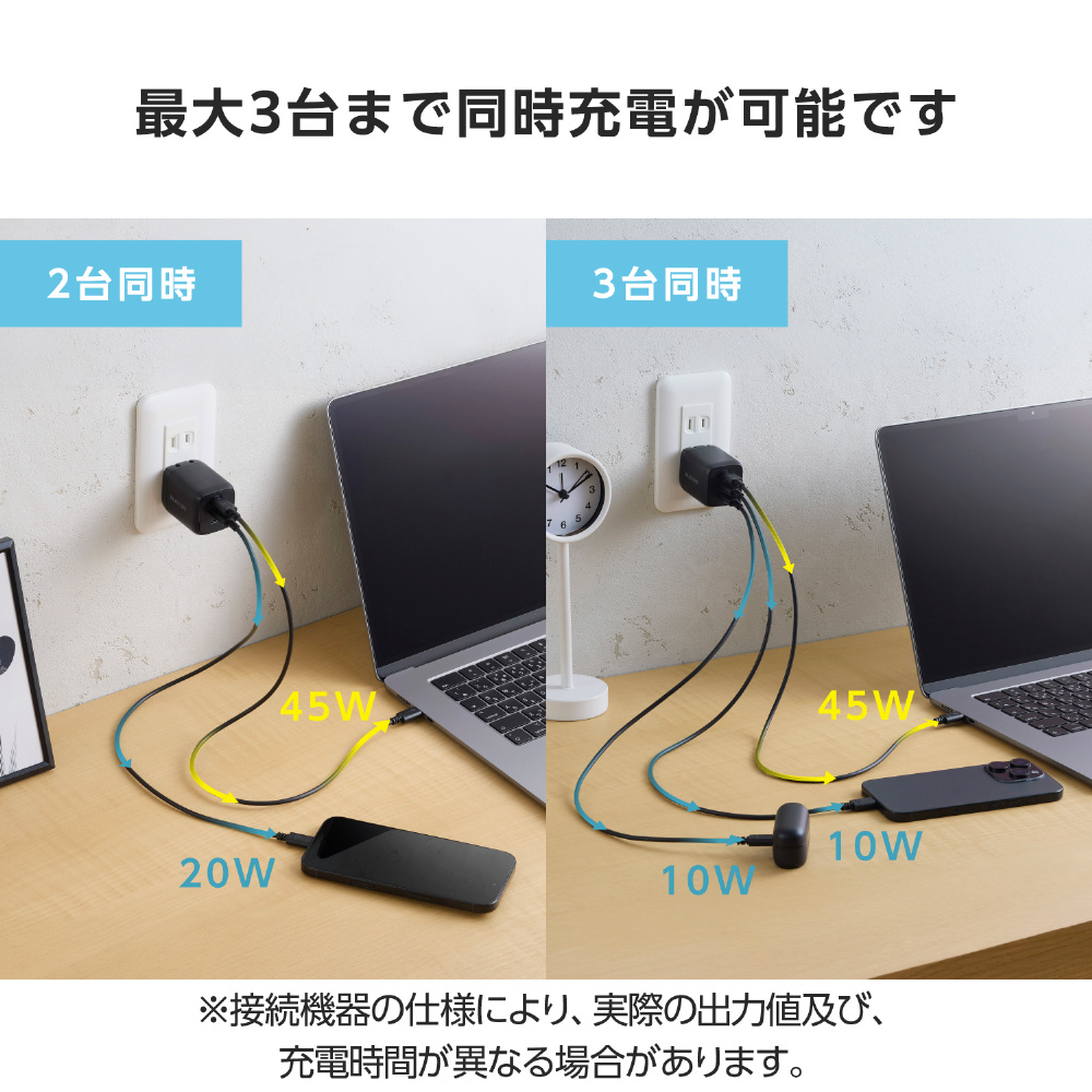 3ポート同時接続時は10W〜45Wでの出力が可能。スマートフォンやタブレット、ワイヤレスイヤホン、電子タバコなどのデバイスを同時に充電できます。