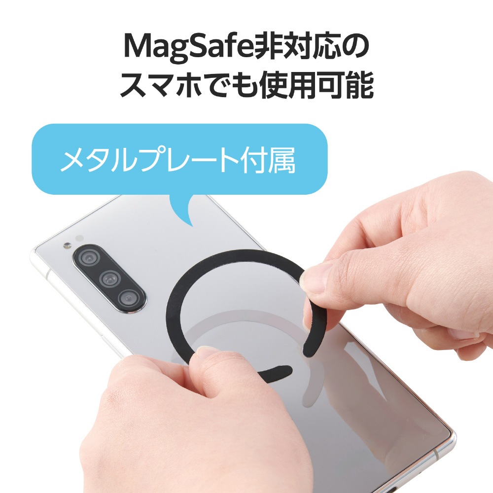 MagSafe対応スマホケースや付属のメタルプレートと併用することで、MagSafe非対応のスマートフォンでも使用可能です。