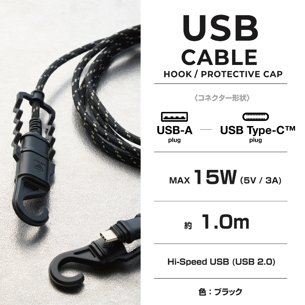 USB Type-C ケーブル < USB-A to USB-C > 1m 高耐久 先端保護 キャップ一体型フック付 IP54 防水/防塵 高速データ転送 充電ケーブル 【 Type C ポート搭載 iPhone iPad Android Xperia 等対応 】 NESTOUT