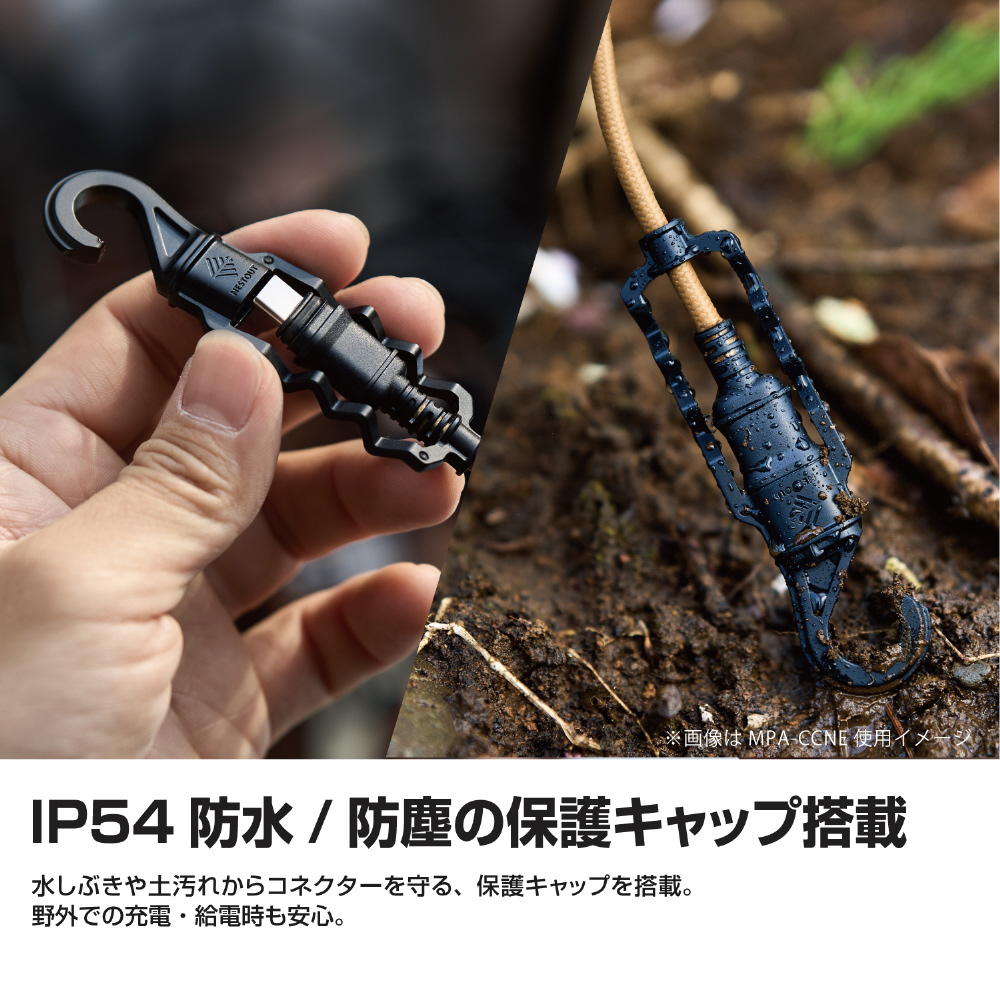 アウトドアシーンでの充電・給電時に活躍!高い防水・防塵性能を備えた高耐久USBケーブルです。ケーブル外皮・内部配線に耐久力を高める構造を採用。JIS保護等級IP54で水や土汚れ、砂ぼこりからコネクターを守るから、キャンプやハイキングでも安心して使える頼もしい存在。ポータブル電源やモバイルバッテリーとの相性も抜群です。