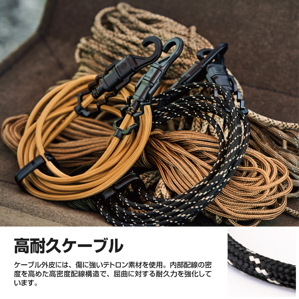 ケーブル外皮には、傷に強いテトロン(R)素材を採用。アウトドアシーンでも思い切り使えます。