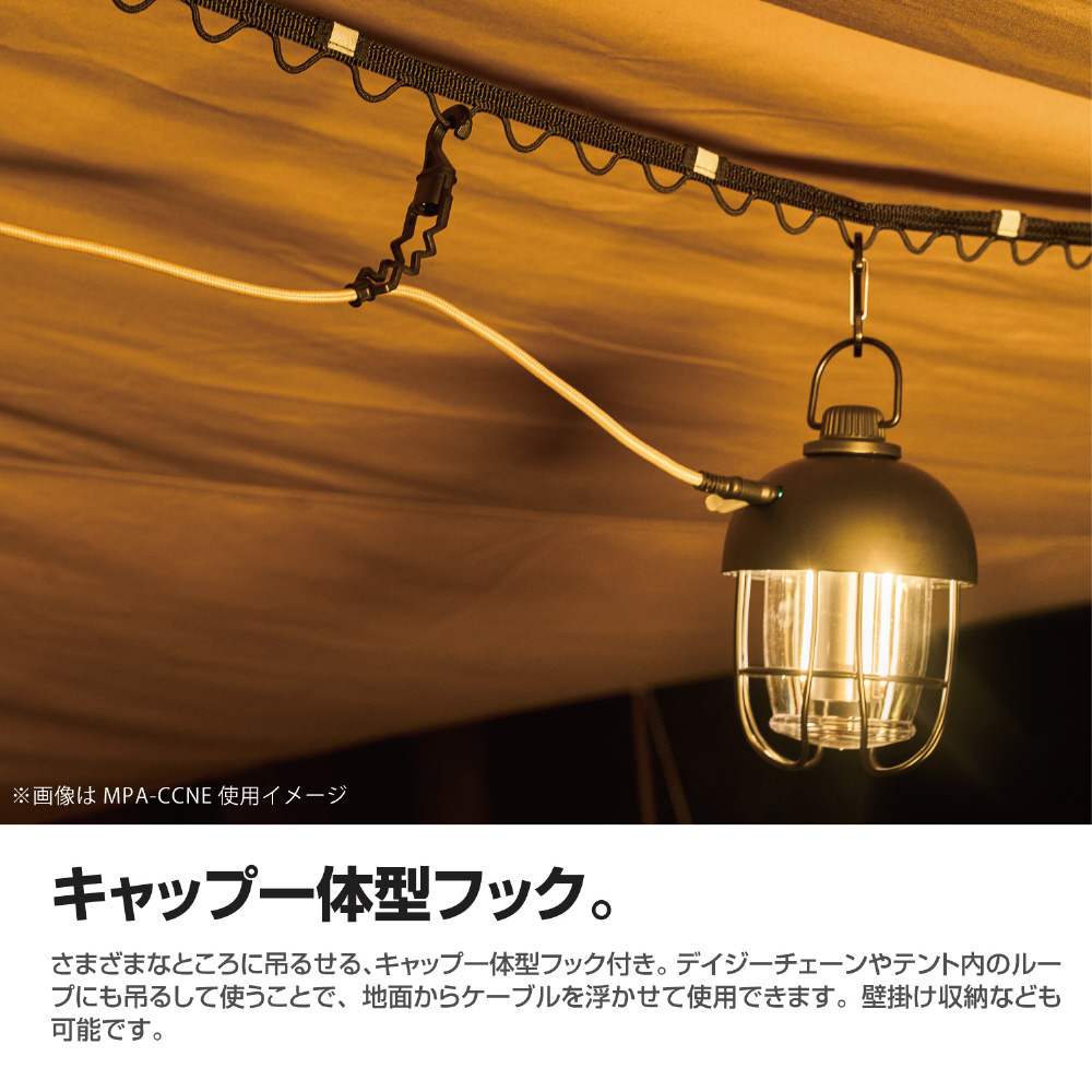 さまざまなところに吊るせる、キャップ一体型フック付き。デイジーチェーンやテント内のループに吊るして使うことで、地面からケーブルを浮かせて使用できます。壁掛け収納なども可能です。