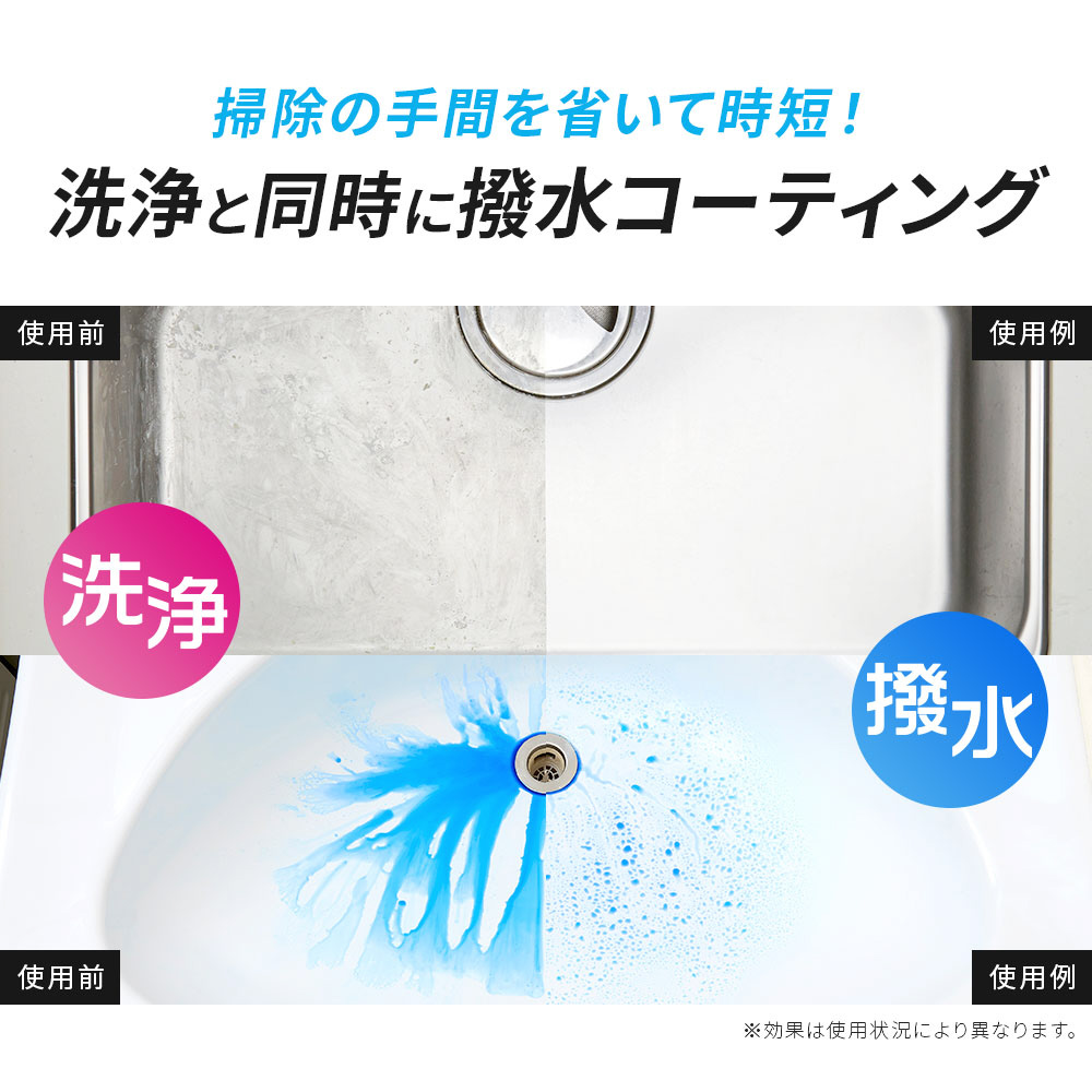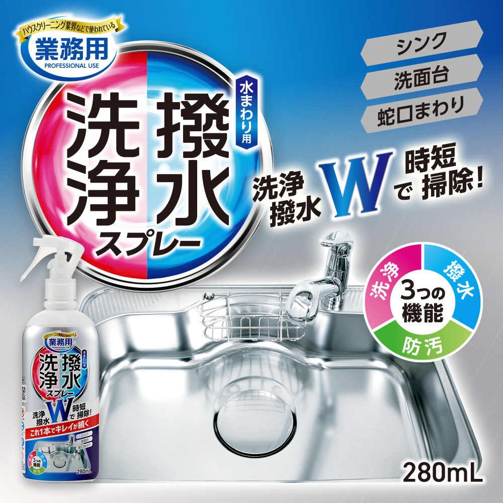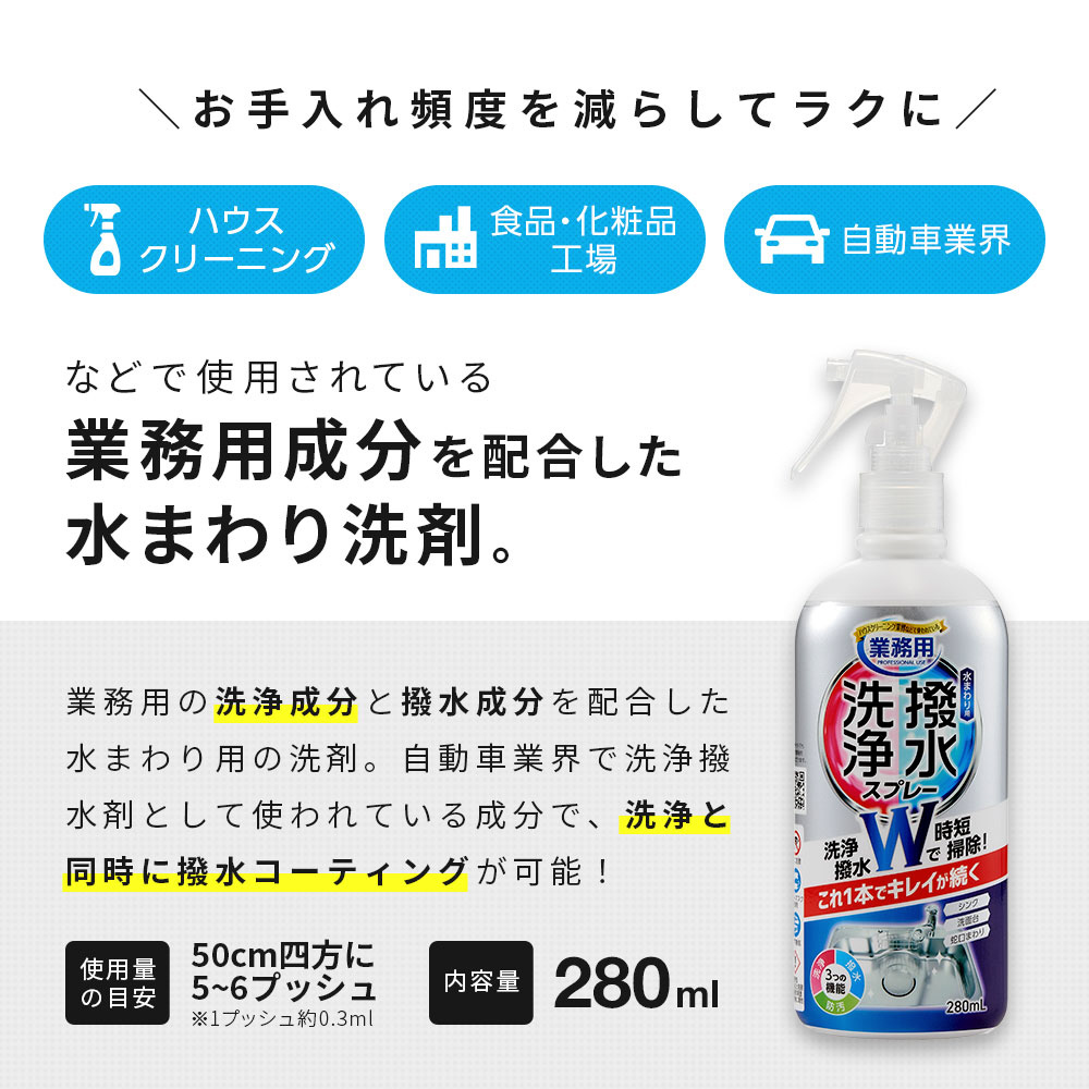 ハウスクリーニング業界などで使われている洗浄・撥水スプレー。これ1本で洗浄・撥水・防汚の3つの効果を発揮し、水まわりのキレイが続く!洗浄と同時に撥水コーティングで、水をはじくことで水滴が滑りおちやすくなり、水アカを防ぎます。シンク、洗面台、蛇口まわりの時短掃除に。
