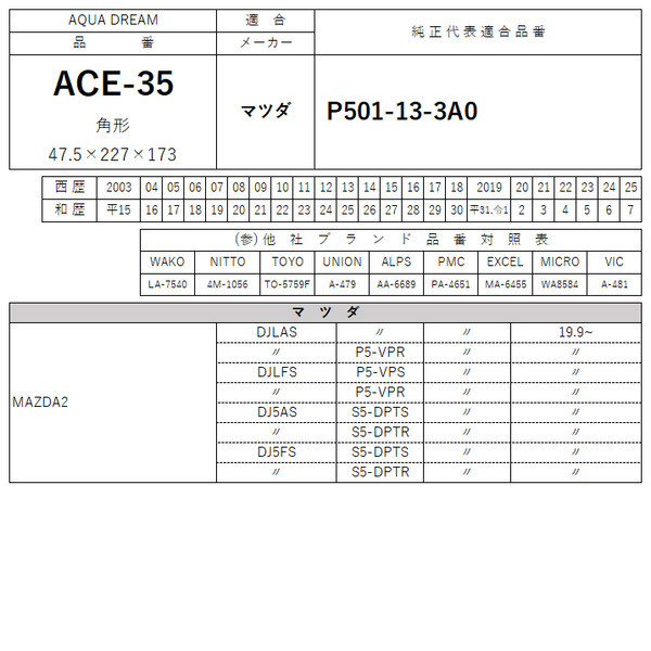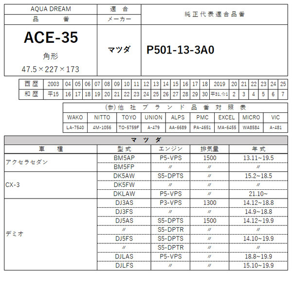 ■互換品番:「WAKO」LA-7540・「NITTO」4M-1056・「TOYO」TO-5759F・「UNION」A-479・「ALPS」AA-6689・「PMC」PA-4651・「EXCEL」MA-6455・「MICRO」WA8584・「VIC」A-481