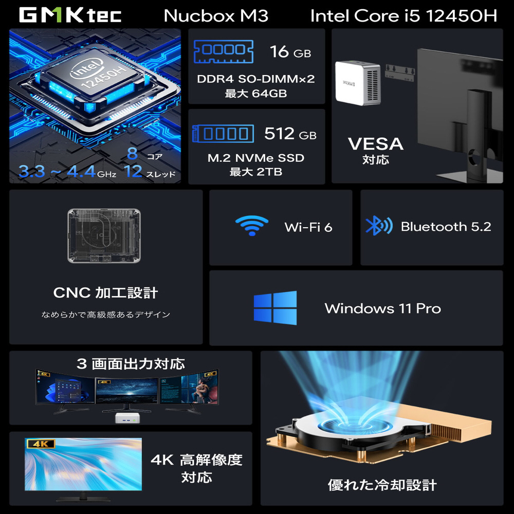 GMKtec NucBox M3は、Intel Core i5-12450H Processorを搭載した高性能ミニPCです。8コア12スレッド、最大4.4 GHz動作の高性能CPUと16 GBの大容量メインメモリ、512 GBのM.2 PCIe 3.0 高速SSDを搭載することで画像や動画編集なども快適に行えます。HDMI×2とUSB-C端子を組み合わせて最大3画面同時出力に対応します。