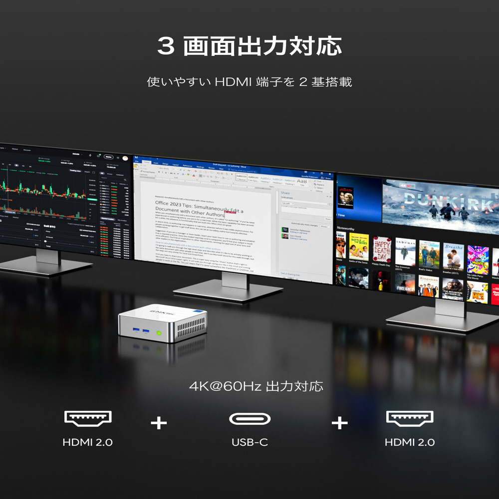 2つのHDMI 2.0とUSB4端子により、最大で3画面同時出力に対応します。