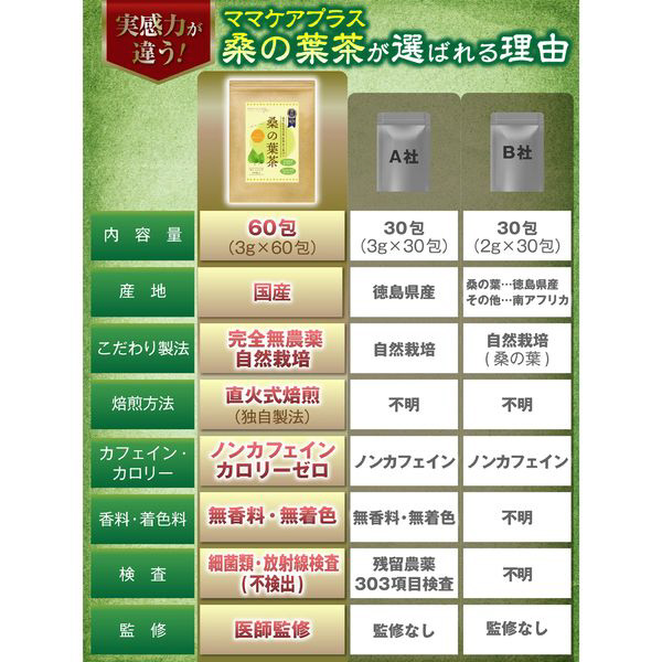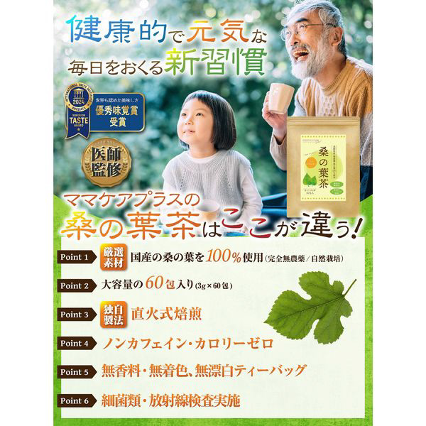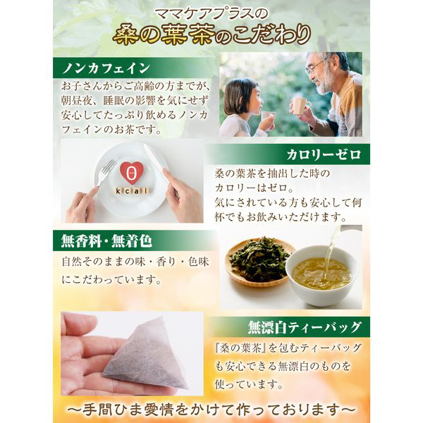 ママケアプラスの桑の葉茶は、ノンカフェイン・カロリーゼロ、無香料・無着色、無漂白ティーバッグ を使用。更に細菌類・放射線検査を実施していますので、安心してお召し上がりいただけます。