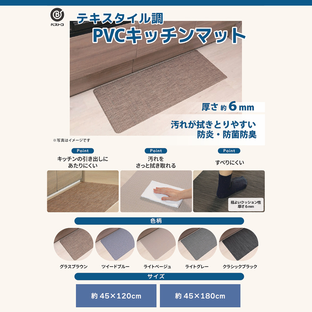 ■防炎・防カビ・防菌防臭を兼ね備えつつ、テキスタイル調素材で温かみのあるPVCキッチンマット。汚れてもさっと拭き取れます。