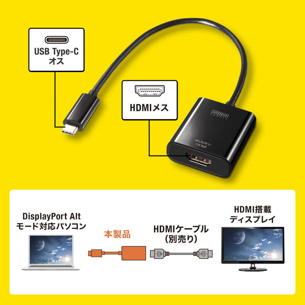 DisplayPort Altmodeに対応したType-CポートをHDMI(4K/60Hz/HDR)に変換し映像出力ができる変換アダプタ。