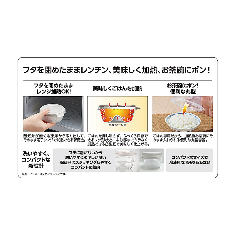 新構造ごはん専用冷凍保存容器、蒸気弁レスでフタをしたままレンジ加熱