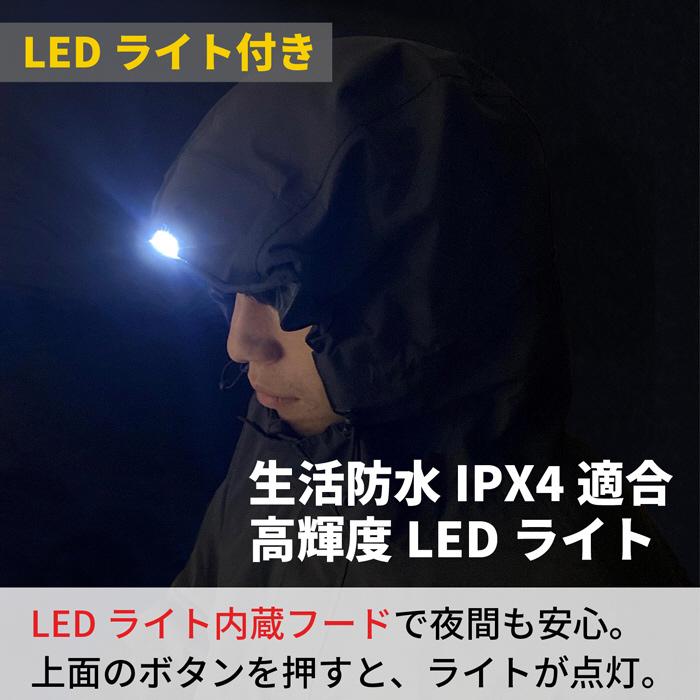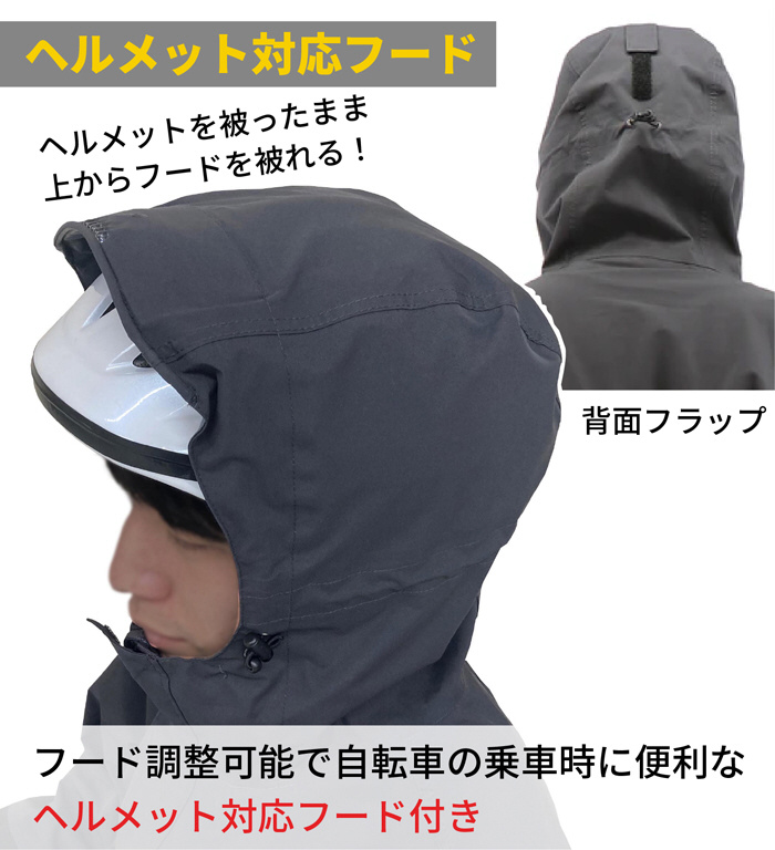 フード調整可能で自転車の乗車時に便利なヘルメット対応フード付き