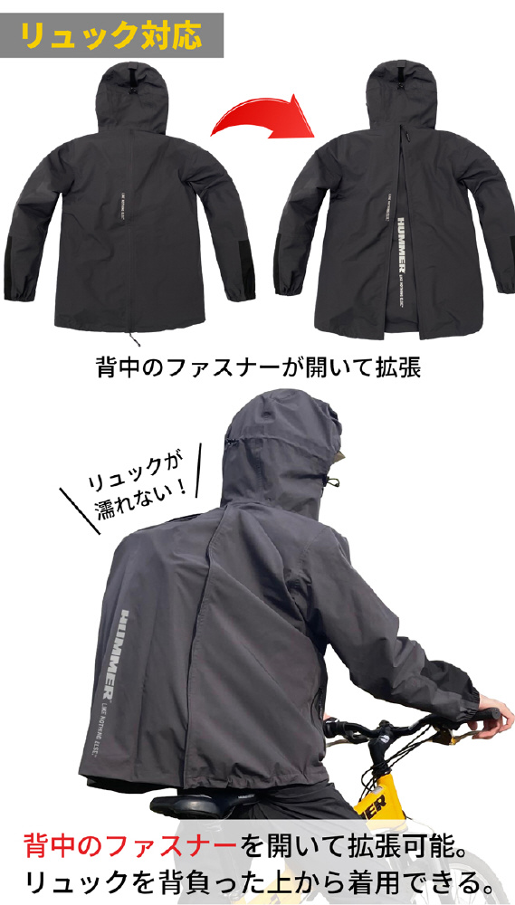 ・背中のファスナーを開いて拡張可能。リュックを背負った上から着用できる