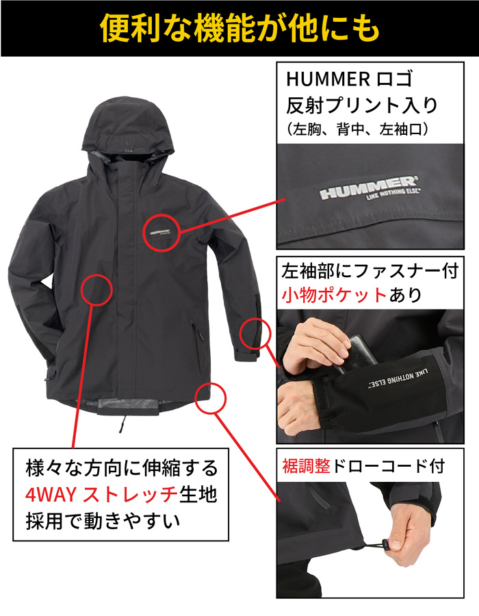 ・HUMMERロゴ反射プリント入り(左胸、背中、左袖口)