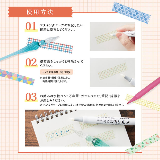 水性サインペンや万年筆インキをはじかずに書ける、マスキングテープへの下地ペン。マスキングテープに塗って乾かすだけで、きれいに文字書きできます。