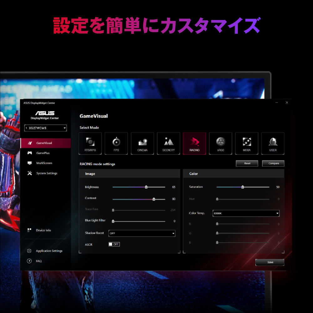 物理的なボタンを使わずに、直感的なDisplayWidget Centerアプリでモニターの設定を簡単に調整できます。さまざまなゲームやアプリの設定も簡単にカスタマイズできます。