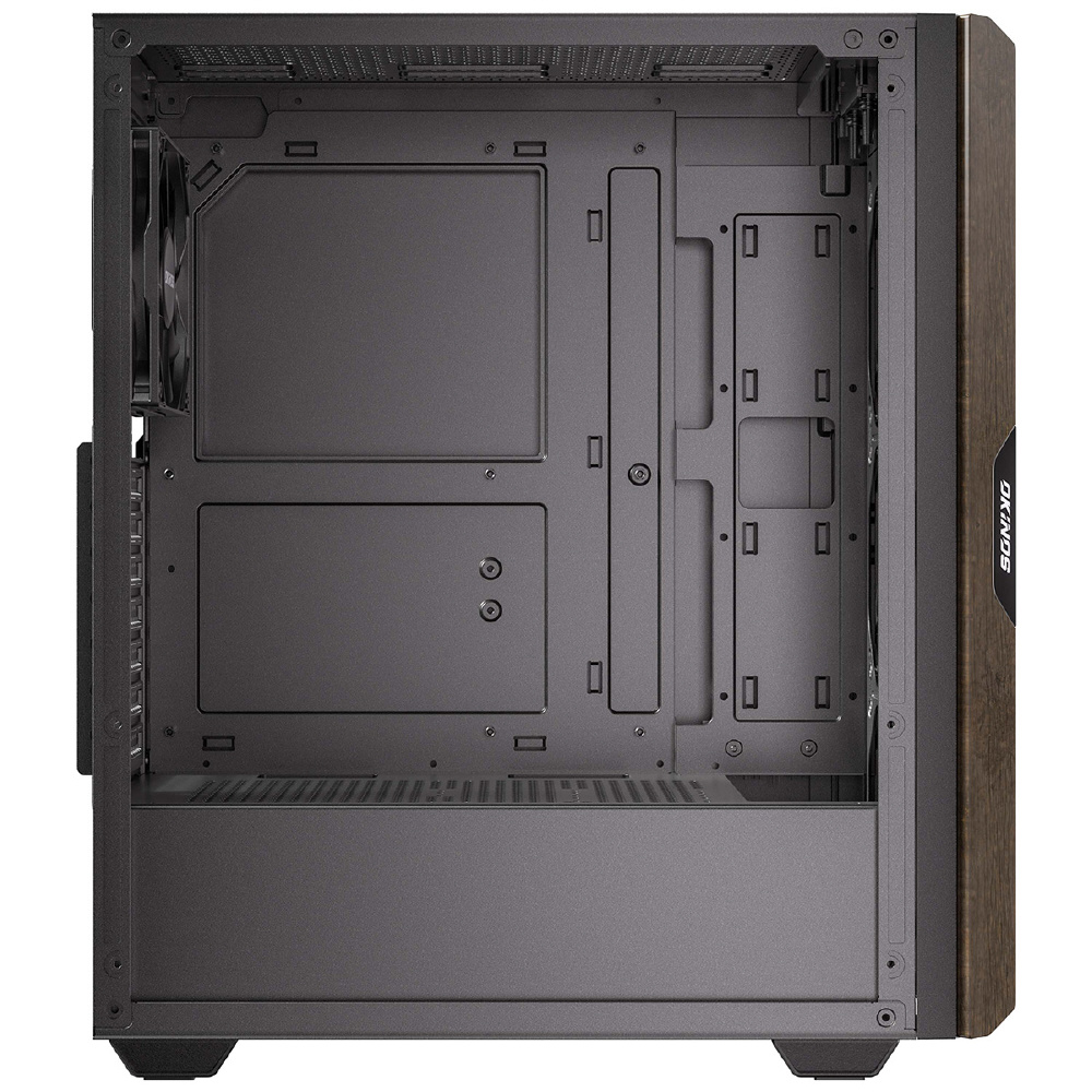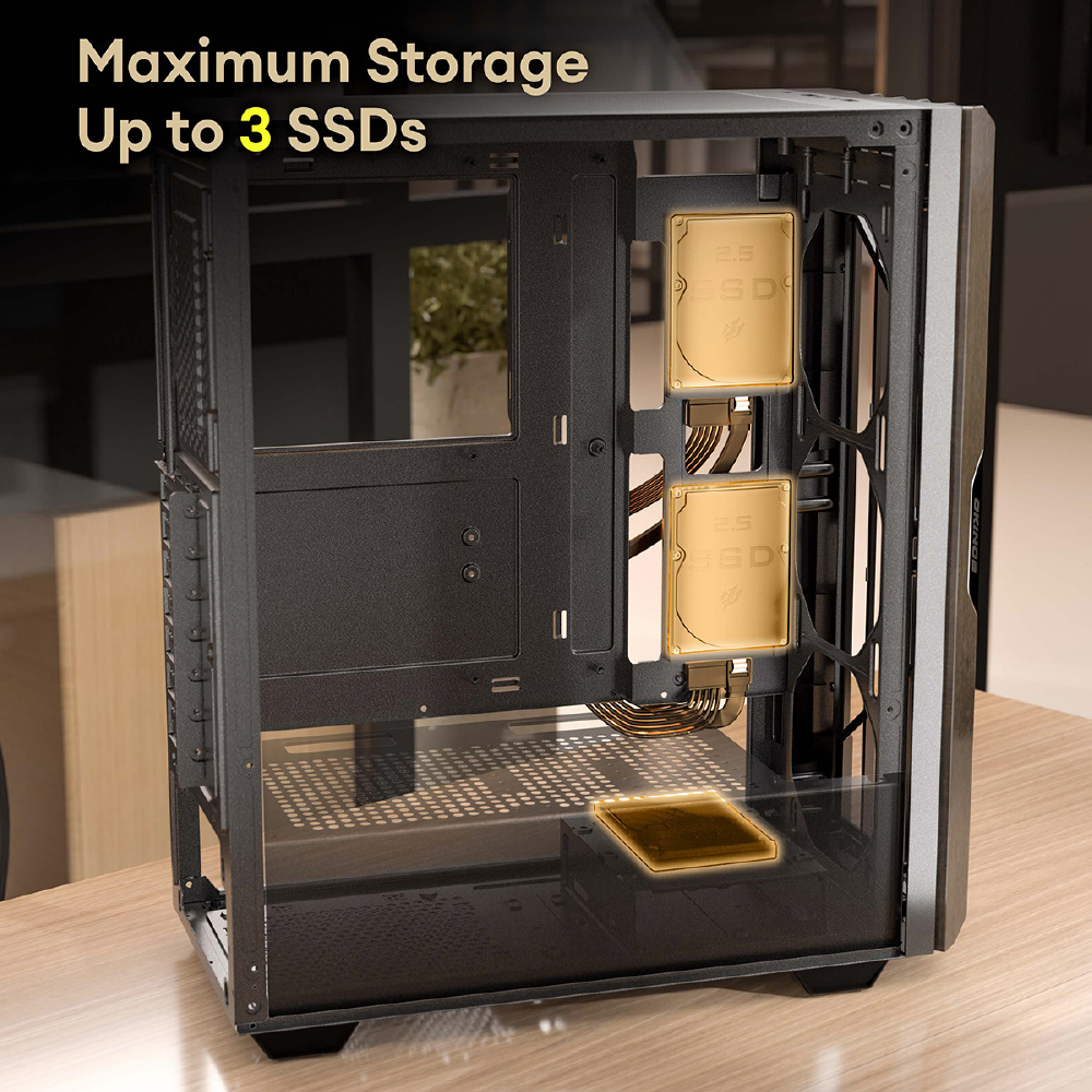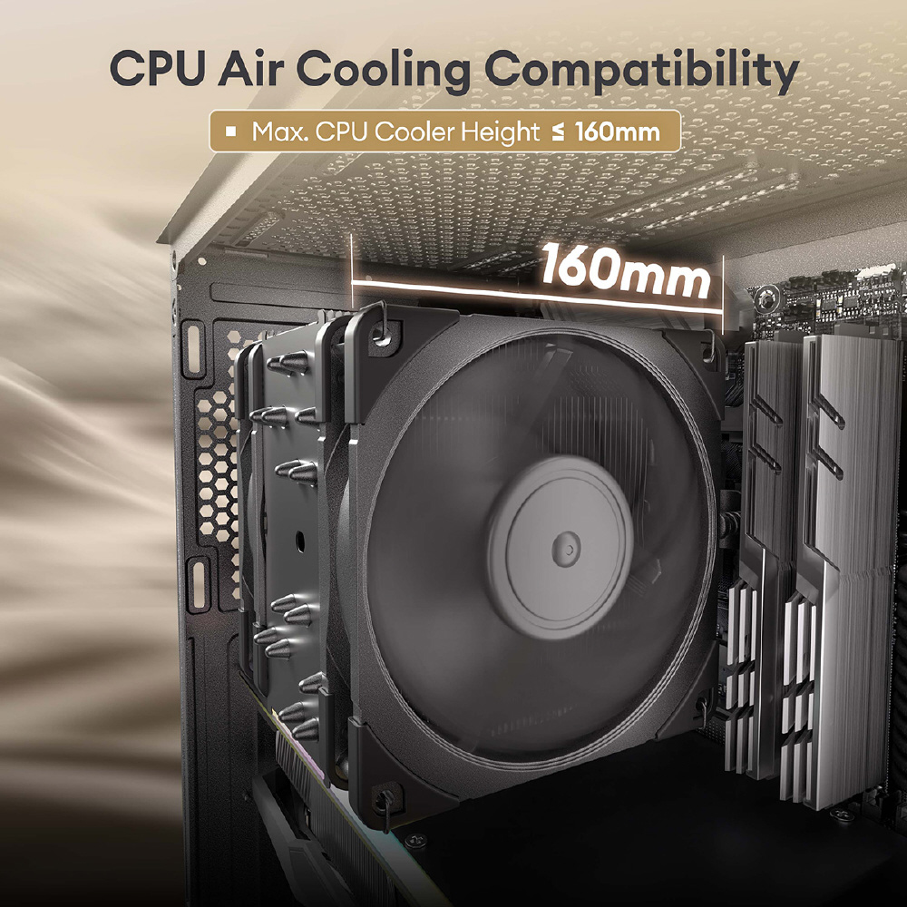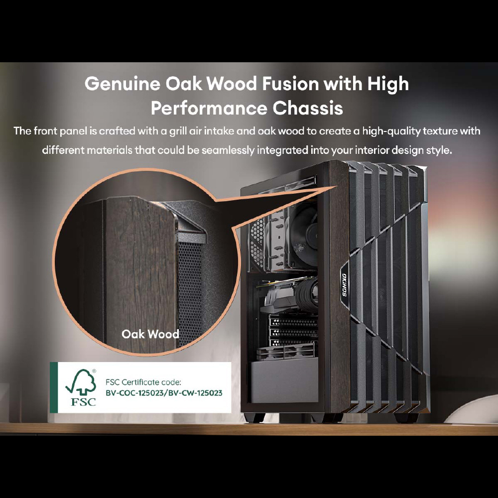 木材をあしらったフロントパネルはきめ細やかなメッシュ構造により、効率よく外気をケース内に取り込みます。トップ、PSUシュラウド、サイド、リアに最大で8個の120 mmファンを同時搭載可能です。