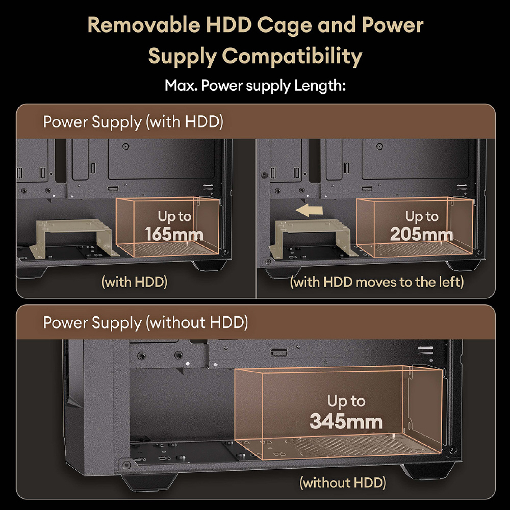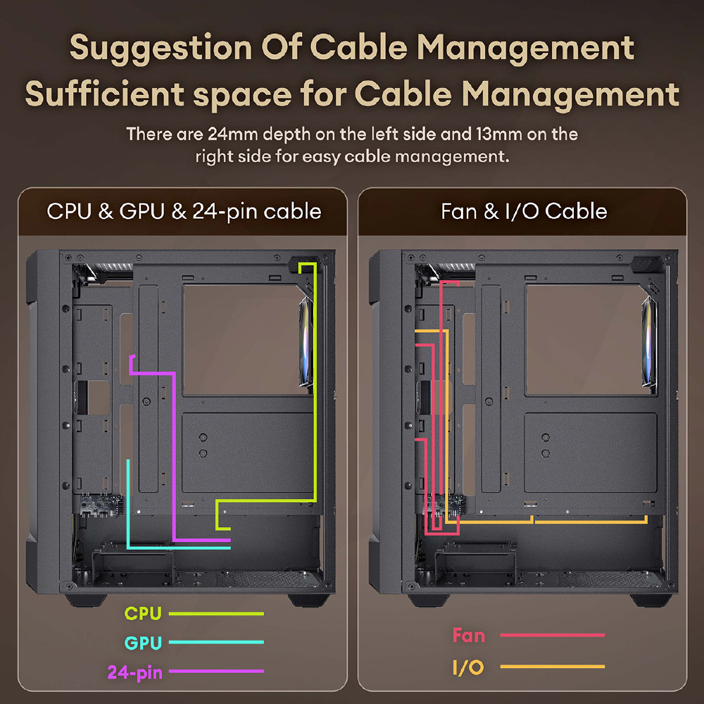 マザーボード裏の裏配線スペース各所にケーブルホールを備え、最大で24 mm幅の余裕あるスペースで電源ケーブルやファン、フロントポートのケーブル類をスマートに収納できます。