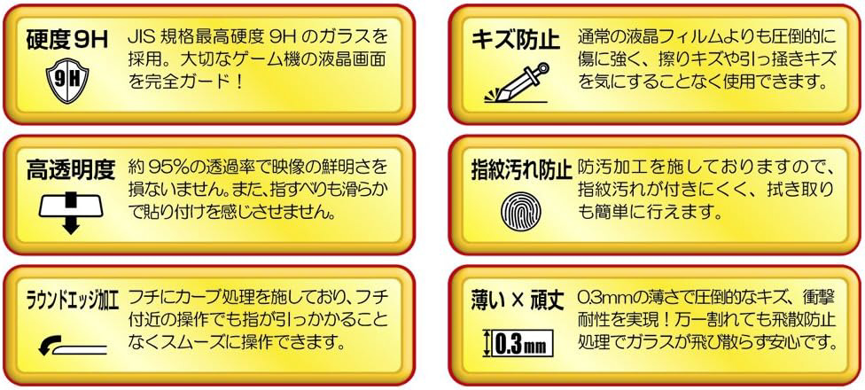 「高透明度」・「飛散防止」・「スムースタッチ」・「防指紋」・「ラウンドエッジ加工」等、ゲームをプレイする上で有用な機能も併せ持つ、