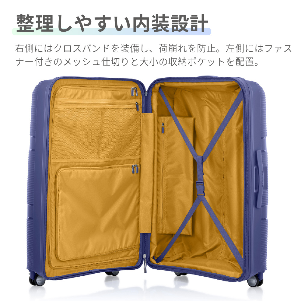 整理しやすい内装設計:右側にはクロスバンドを装備し、荷崩れを防止。左側にはファスナー付きのメッシュ仕切りと大小の収納ポケットを備え、衣類や小物をスマートに整理できます。