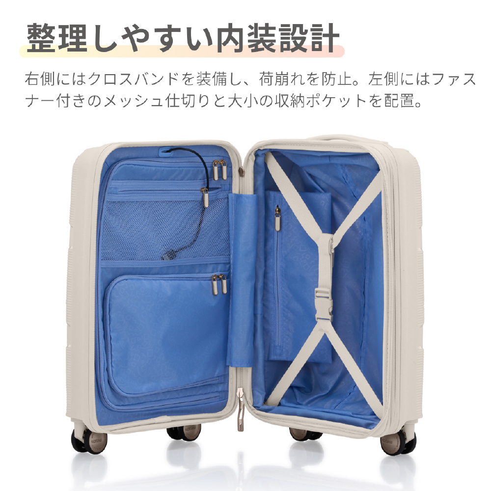 整理しやすい内装設計:右側にはクロスバンドを装備し、荷崩れを防止。左側にはファスナー付きのメッシュ仕切りと大小の収納ポケットを備え、衣類や小物をスマートに整理できます。