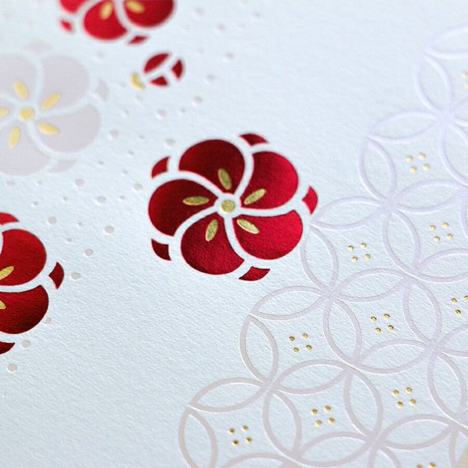 金箔パールピンク箔メタリックな赤箔の3色を重ね合わせて絵柄を表現しています。