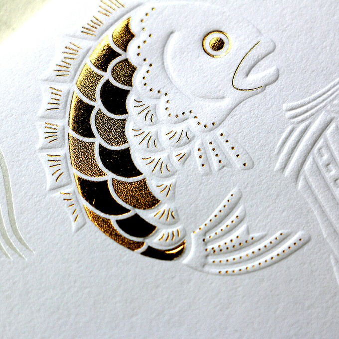 全面にパール箔の箔押し加工を行なった上に、絵柄を立体的に表現する浮き出し加工をしています。