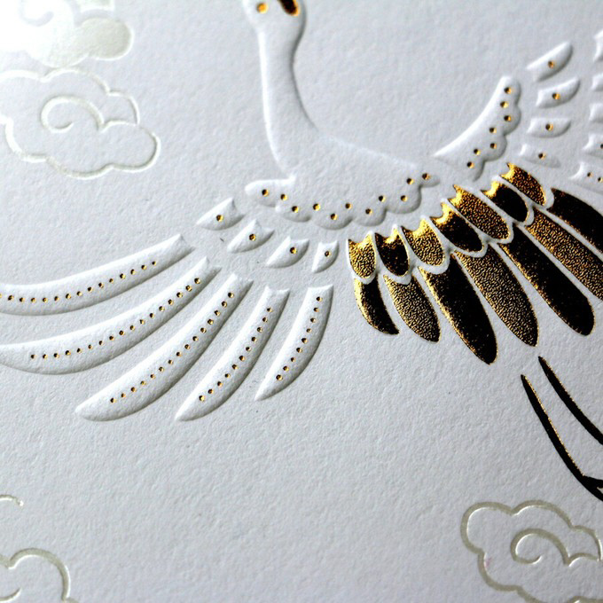 全面にパール箔の箔押し加工を行なった上に、絵柄を立体的に表現する浮き出し加工をしています。